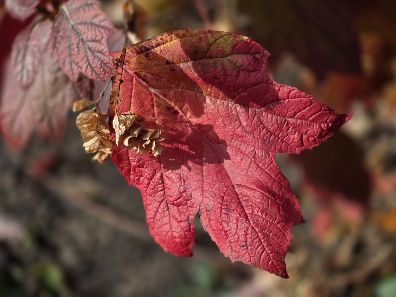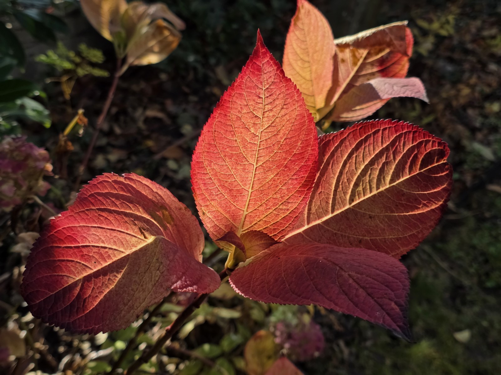 Úžasné sfarbenie listov hortenzie pod jabloňou.