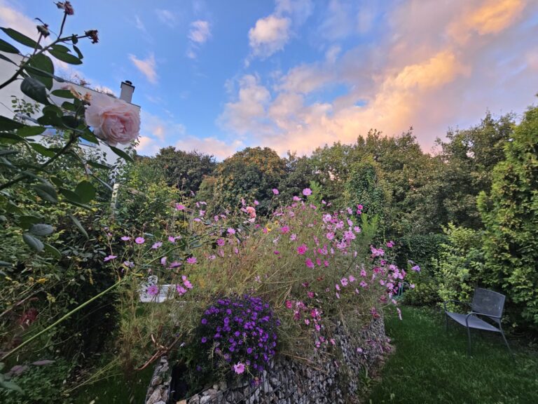 Po nočnom daždi je záhrada poumyvaná a popolievaná. V tomto období prevažuje okrem chrumkavej zelenej fialová farba na klematisoch, budlejách, verbene bonariensis… Dominujú biele gaury s jemnulinkou ružovou. Ďalšou farbou…
